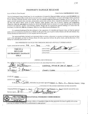 An Insurance Property Damage Release Form is a legal document that is used to release an insurance company from any further liability or responsibility for property damage sustained as a result of an accident. The form is signed by the injured party and the insurance company and is a binding legal agreement.